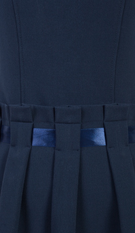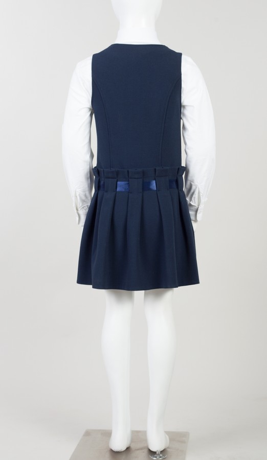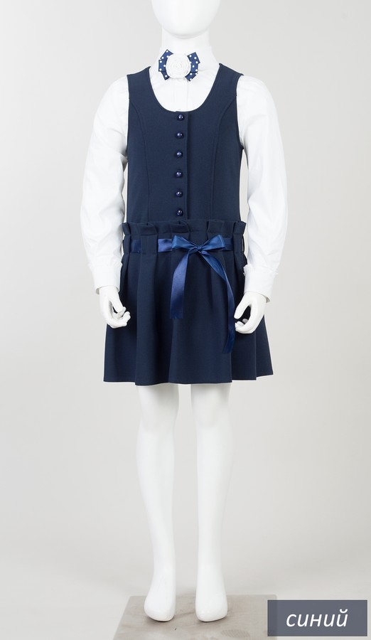 Стильный и очень симпатичный вариант школьного сарафана для маленькой леди! Полочка модели оформлена аккуратным вырезом горловины, фигурными рельефами и центральной застёжкой с миловидными пуговицами. Невероятно эффектный и нарядный элемент сарафана - это оригинально оформленный складками низ, дополненный очаровательной атласной лентой.