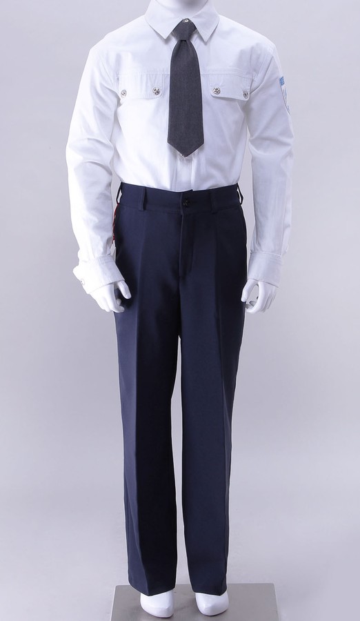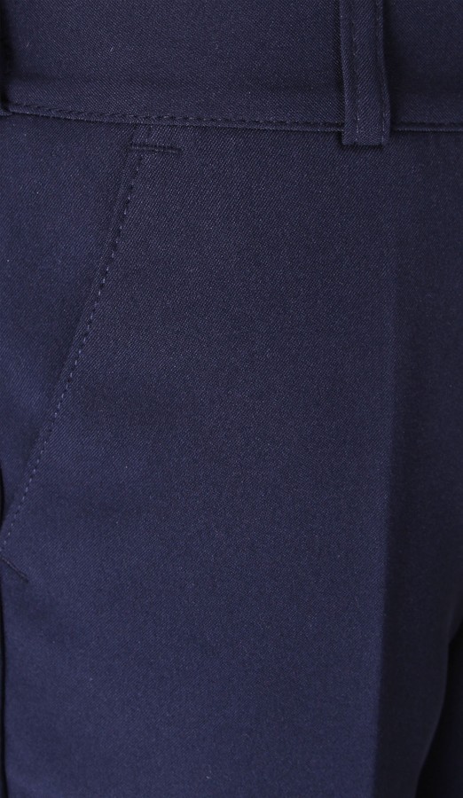 Классические брюки для мальчика прямого силуэта со стрелками по передних половинках на подкладе. Линия талии фиксируется поясом с хомутиками, по бокам которого вшиты резинки. Практичности брюкам придают косые карманы по бокам передних половинок, а также карман с листочкой и с застёжкой на пуговицу на задней половинке.